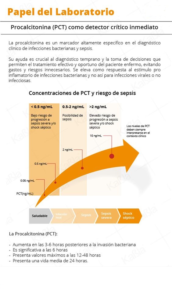 La PCT es un biomarcador sensible para la detección de sepsis. Los niveles séricos se corresponden con la gravedad de la afección y con la respuesta al tratamiento, lo que le otorga gran valor diagnóstico y pronóstico de las sepsis generalizadas, permitiendo la evaluación de la respuesta inflamatoria sistémica. Cuando la PCT permanece elevada, se asocia a un fracaso de la terapéutica aplicada e indica una persistencia de la fuente de infección.