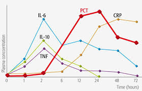 Las concentraciones de PCT circulante en individuos sanos permanece por debajo de 0.05 ng/ml. En infecciones localizadas, puede alcanzar los 0.5 ng/ml. En un estado de sepsis con repercusión sistémica de origen bacteriano, la PCT comienza a aumentar a las 4-6 horas de producido el estímulo, alcanza su concentración máxima entre las 12 y 36 horas siguientes, con valores incluso mayores de 10 ng/ml y luego, cuando dicho estímulo desaparece, comienza a decaer.